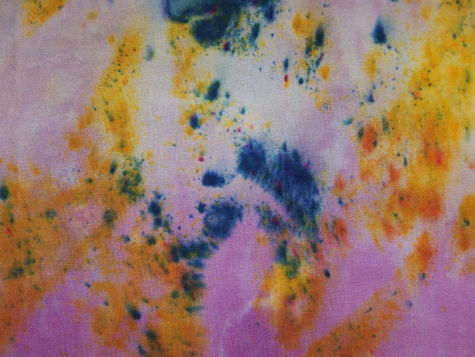 I am not thrilled with the colors on this one but it is a new technique that I wanted to try again. The pink base color is a snow dye that I was not too happy with. The yellow and blue are the new dyeing technique that Rosalita showed us. First you soak the fabric in soda ash water then lay it scrunched up on some plastic or a tub. Next sprinkle the dry powdery dye onto the fabric. Then let sit for an hour before rinsing and washing as usual. This method gives a very spotted results as I hope you can see in the close-up.